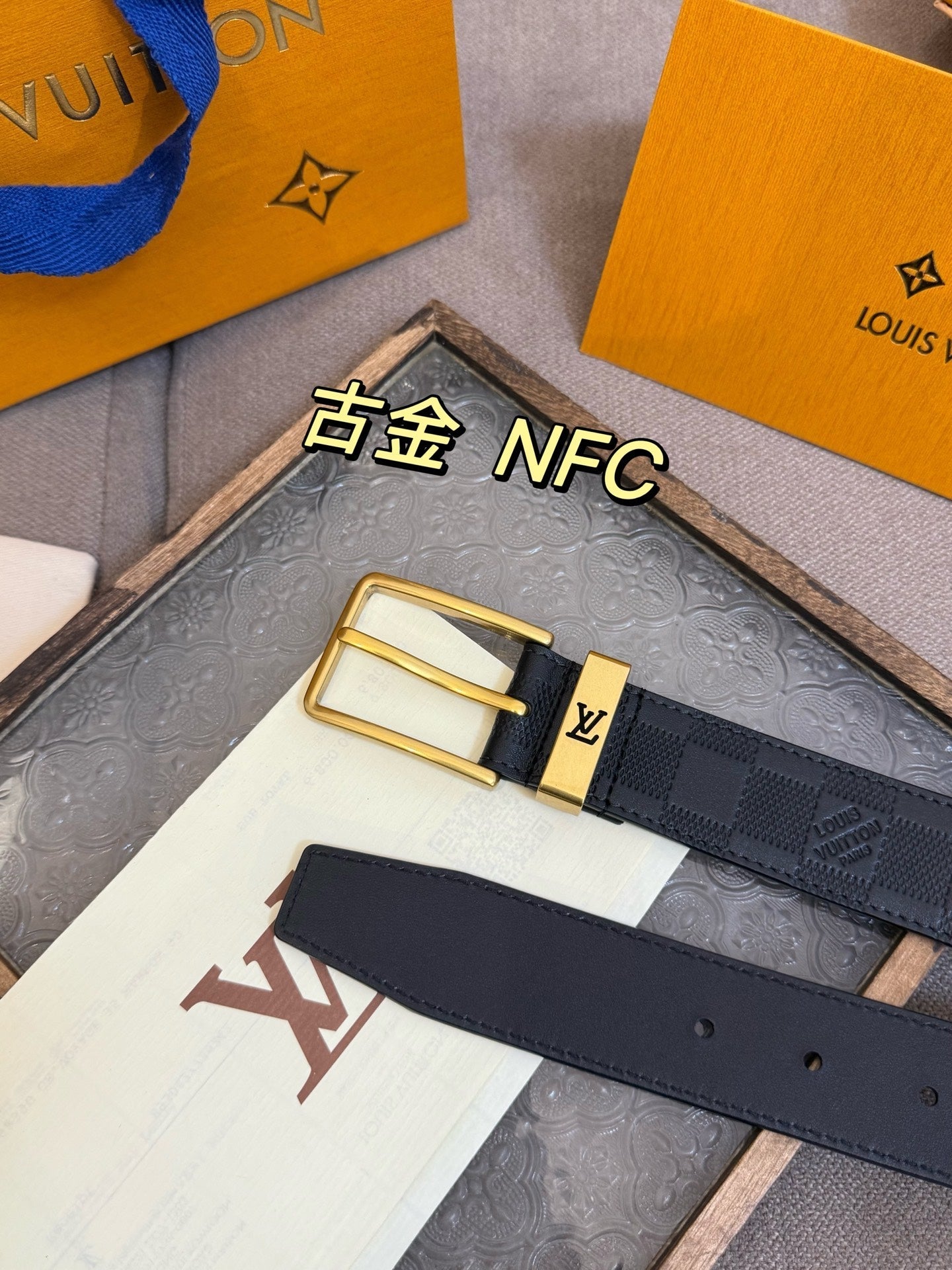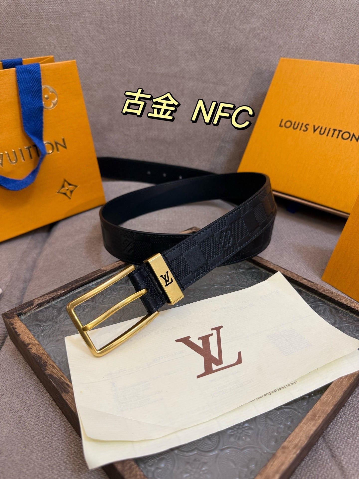 Top layer cowhide checkered golden belt 3.5cm
